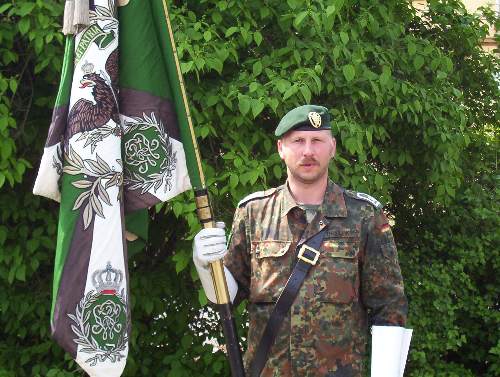Tradition ist Trumpf bei der Reserve: Hauptfeldwebel des Heimatschutzbataillons 56 mit Traditionsfahne im Jahr 1990 – Foto: New York Public Library / Wikipedia / gemeinfrei